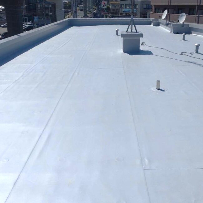 下地コンクリート補修をした後に絶縁工法にて、塩ビシート防水を施工しました。