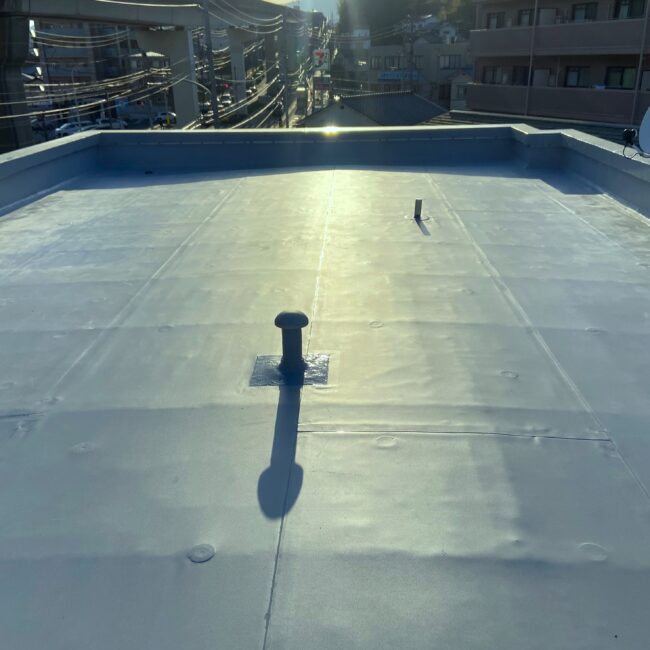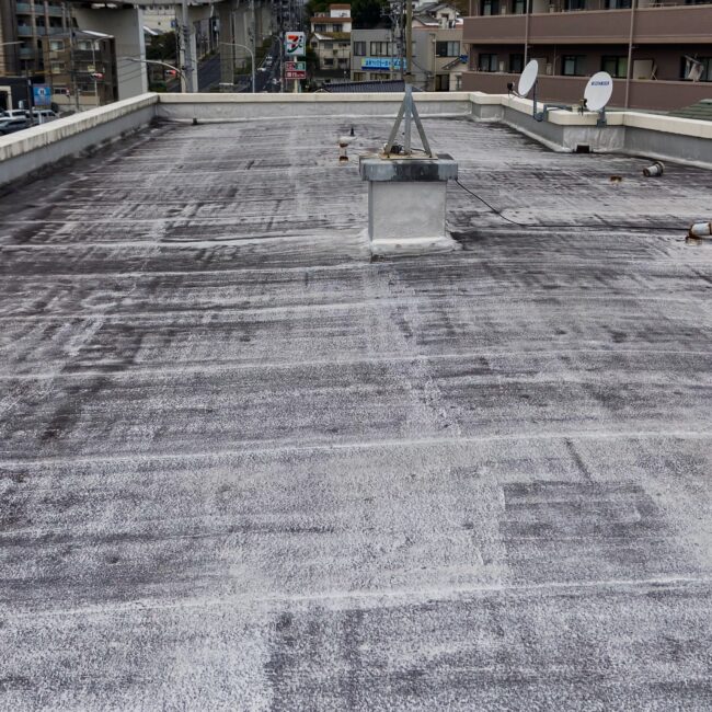 下地コンクリート補修をした後に絶縁工法にて、塩ビシート防水を施工しました。 下地から湿気や水分の影響を受けにくくし、防水層の耐久性を向上させます。 屋上の防水が耐久性向上し、美しく生まれかわりました。