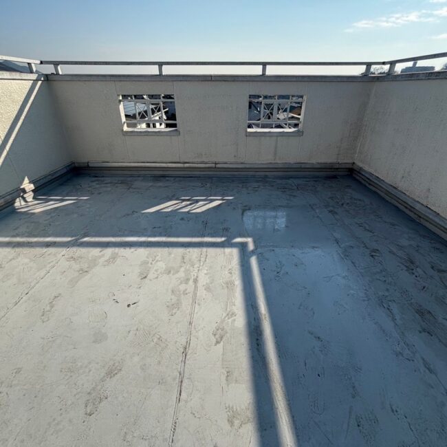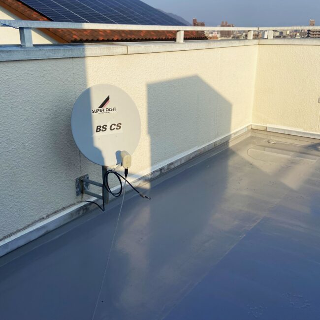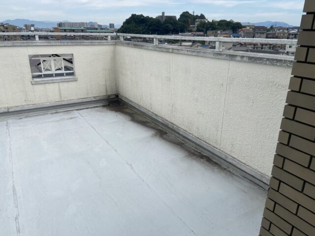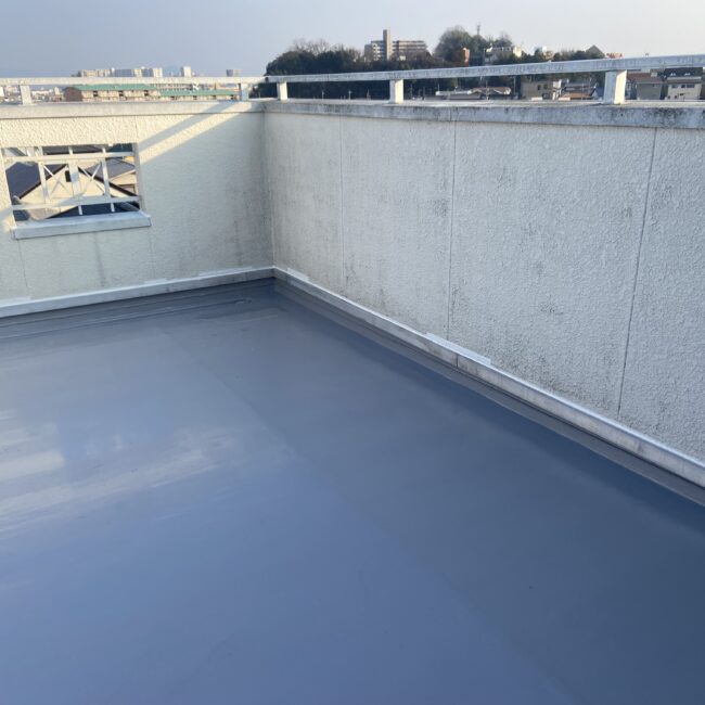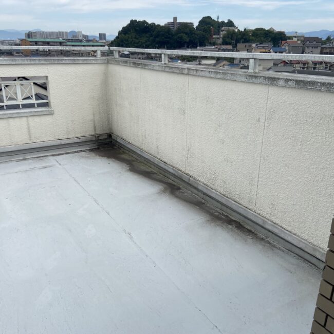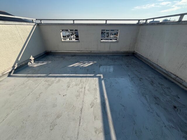既存防水層が劣化して雨漏れしていたので、継ぎ目のないシームレスな防水層に仕上がるウレタン塗膜防水にて施工しました。
